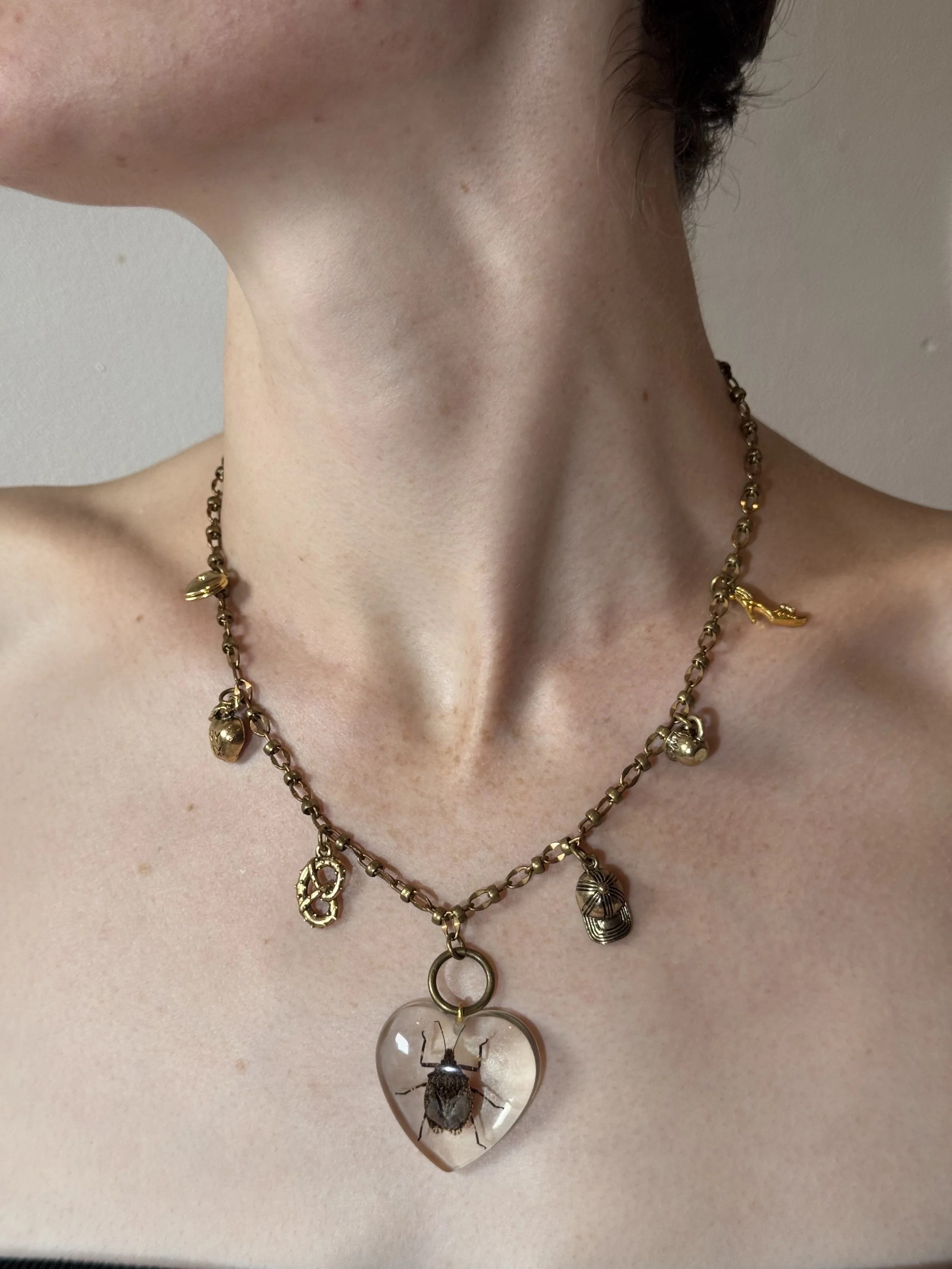 for sale › empire state charm necklace Image 1 of 2 Image 2 of 2 empire state charm necklace Sale Price: $55.00 Original Price: $70.00 made with metal chain, assorted charms, and a stink bug in resin :) Add To Cart Added! made with metal chain, assorted charms, and a stink bug in resin :)
